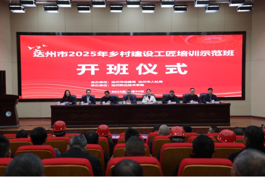 11月20日上午,达州市2025年乡村建设工匠培训示范班开班仪式在我校望犀校区明理楼一楼学术报告厅举行,市住房和城乡建设局机关党委书记袁秀炳,市就业服务管理局局长徐群英出席仪式并作动员讲话,我校党委委员、副校长王彦致辞。