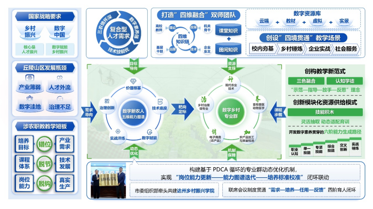 4.建立“评—诊—改”动态优化机制。依托数字平台,构建以“理论掌握、技能应用、问题解决”为核心的三维评价体系,实施“基础操作→复杂应用→创新成果→社会效益”四层进阶评价指标,通过能力画像精准优化教学。联合制定《数字新农人培养标准》,通过PDCA循环建立“岗位能力更新—能力图谱迭代—培养标准校准”机制,每年动态调整专业群目标和课程体系,确保人才培养围绕乡村需求动态更新。