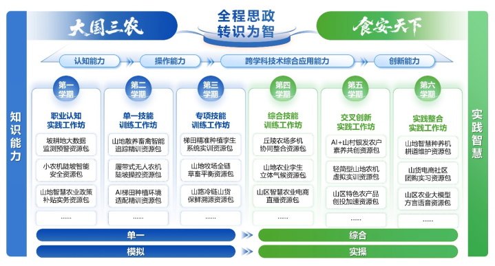 1.开发数字素养贯穿的六阶能力生成路径。依据“数字新农人”五维能力图谱,对接丘陵山区数字农业岗位要求,设计“职业认知→单一技能→专项技能→综合技能→交叉创新→实践整合”能力生成路径(图四)。各阶段融入数字技术应用素养,强化项目化、情境化教学,政校村企协同育人。每阶段配套模块化工作坊和资源包,支持学历教育与培训按需选用,形成数字素养与职业能力同步发展的“育训合一”培养路径。