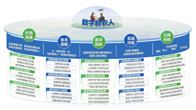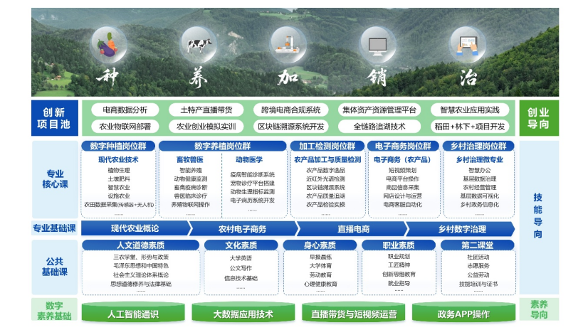 3.跨院系重组数字乡村专业群。围绕丘陵山区乡村振兴与数字化转型需求,打破院系和专业壁垒,整合现代农业技术、畜牧兽医、农产品加工与质量检测、电子商务(农产品)、乡村治理微专业等资源,构建覆盖“种—养—加—销—治”农业全产业链的数字乡村专业群。专业群内要素互补、技能交叉、路径贯通,实现学历教育与社会培训一体化设计,精准服务区域农业现代化与治理能力提升。