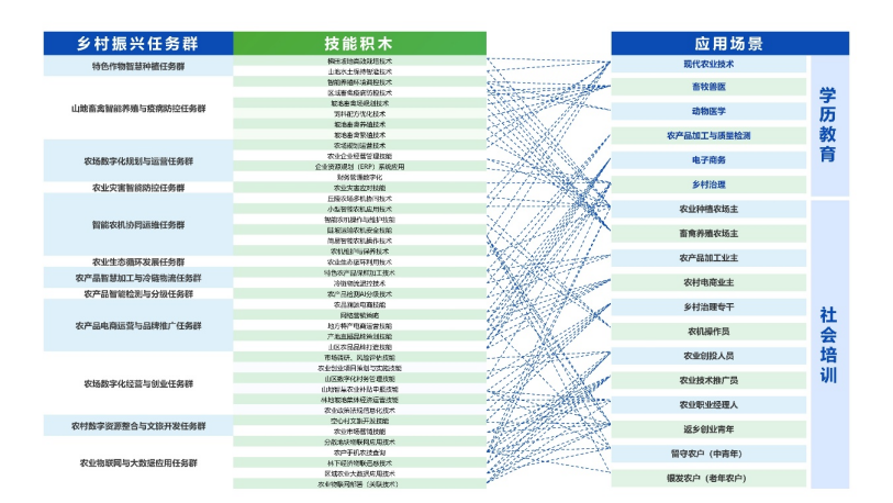 3.创新“技能积木”模块化资源供给模式。针对学历教育与培训差异化需求,开发农业物联网应用等53个可拆解、可组合的“技能积木”,组建“技能积木池”(图六)。根据培养对象差异,针对性抽取并灵活组装为学历课程或培训套餐,实现育训无缝衔接。