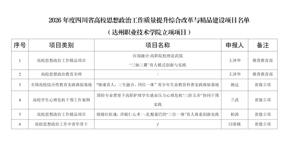 近日,四川省教育厅公布了2026年度四川省高校思想政治工作质量提升综合改革与精品建设项目立项名单,我校6个项目获得立项,其中2个项目拟推荐至教育部。入选总数创学校历年新高,位居全省高职院校前列,标志着我校在深化思想政治工作改革创新、提升育人实效上取得了扎实的阶段性成果。
